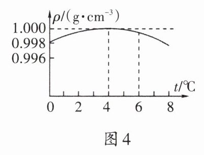5. 某次实验中,烧杯里盛有$6^{\circ}C$的水,有一小球在水中恰好悬浮。经研究发现,水的密度随温度的变化的图像如图4所示。现在烧杯四周放上大量的冰块,在烧杯内水的温度下降到$0^{\circ}C$的过程中,假设小球的体积始终不变。关于小球的浮沉情况,下列判断正确的是(