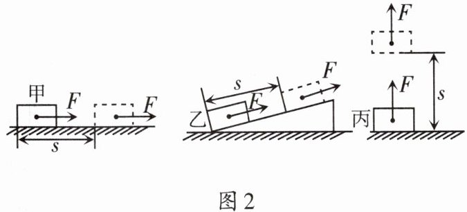 4. 现有甲、乙、丙三个质量不同的物体$ (m_{甲} > m_{乙} > m_{丙}) $,在相等的恒力$ F $作用下,分别在水平方向、沿斜面向上、竖直方向通过了相等的距离$ s $,如图2所示。$ F 在三种情况下做的功分别为 W_{甲} $、$ W_{乙} $、$ W_{丙} $,关于三者的大小关系,下列判断正确的是 (