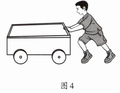 7. 在某次劳动课上,李陆同学用$ F_{1} = 200N $的力水平向左推小车(如图4所示),刘湾同学用$ F_{2} = 100N $的力也作用在小车上,要使两人作用在小车上的力的效果最大,这两个力的方向必须