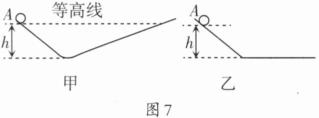 时,小球将到达右侧等高线处。(2)欧阳在上述第①次实验中,取下毛巾,其他条件不变,只减小了右侧斜面的倾角。他发现倾角越小,小球在右侧斜面上运动的距离越大。进一步推理得出:当右侧斜面的倾角为0°时,如图7乙所示,如果小球在水平面上运动时受到的阻力为0,则小球将做