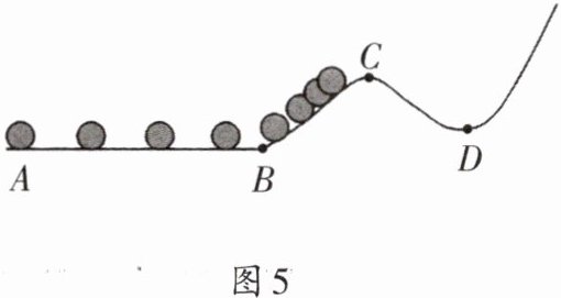 $v_{1}$(选填“大于”“等于”或“小于”)。(2)当小球以$v_{1}$推出离开手后,小强利用相机拍下小球从A运动到C的过程,每经过相同时间时的位置照片,如图5所示。在AB轨道上,小球受到的重力做功为