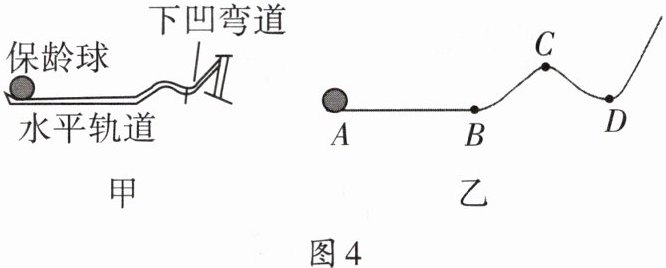 8. 小强在夜市见到一种“过山车保龄球”游戏,如图4甲所示,只要把保龄球从水平轨道以一定速度推出,球最终能停止在下凹弯道上,就算挑战成功,可获得丰厚奖金。小强发现几乎没有能挑战成功的人。他回家做了一个相似的模型,如图4乙所示,其中AB为水平轨道,C为上凸弯道的最高点,D为下凹弯道的最低点。