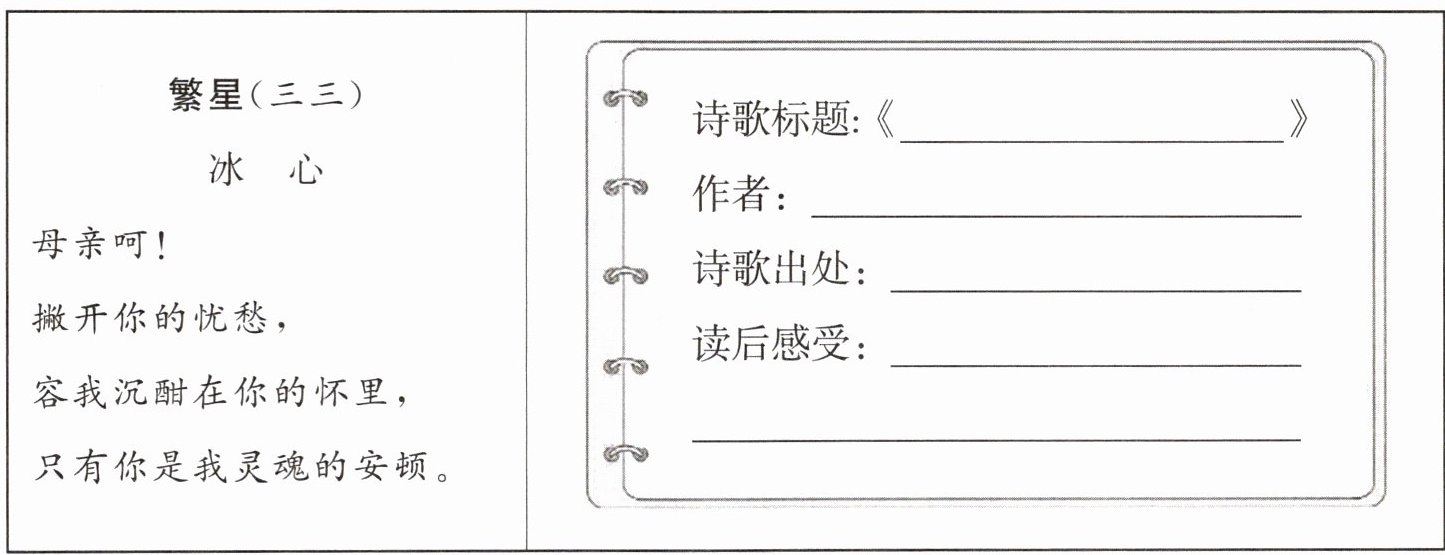 诗歌标题:《繁星(三三)》;作者:冰心;诗歌出处:《繁星·春水》;读感受:这首诗体现了母亲对孩子的重要性,母亲的怀抱是孩子灵魂的安顿之处,让人感受到母爱的温暖与力量。