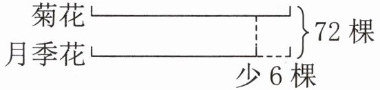 设月季花有$x$棵,因为菊花比月季花多$6$棵,所以菊花有$x + 6$棵。已知菊花和月季花一共有$72$棵,可列方程:$x + (x + 6) = 72$,$2x + 6 = 72$,$2x = 72 - 6$,$2x = 66$,$x = 33$。