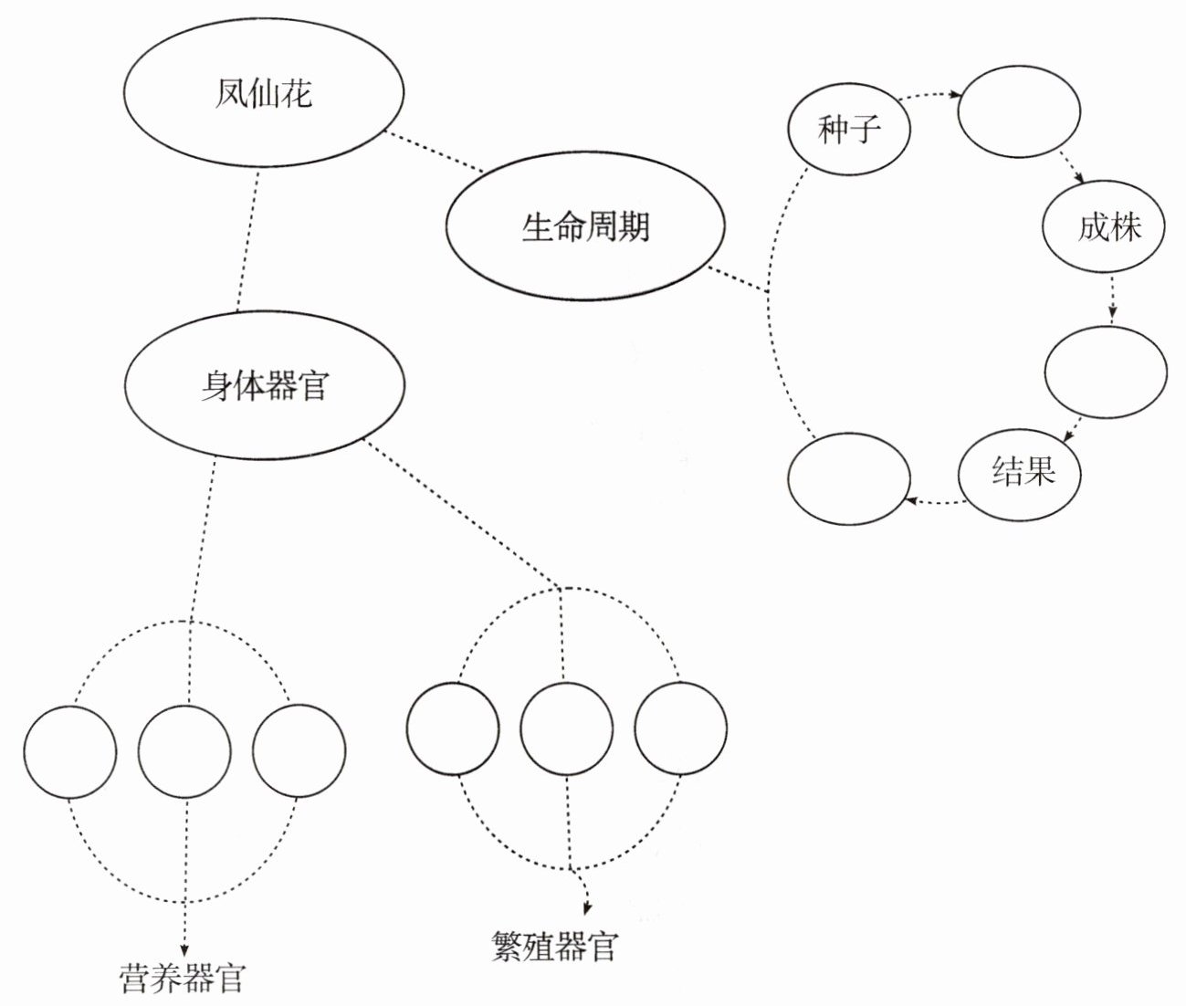 从左至右,从上到下:根 茎 叶;花、果实、种子;幼苗、开花、死亡。