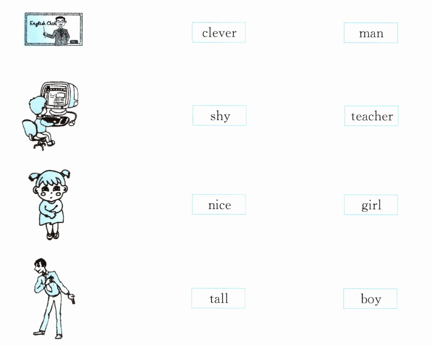 第一幅图连“man”“teacher”;第二幅图连“boy”“clever”;第三幅图连“girl”“nice”;第四幅图连“tall”“man”。
