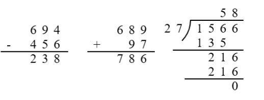 $238+456=$ $786-97=$ $58×27=$ $364÷3=$