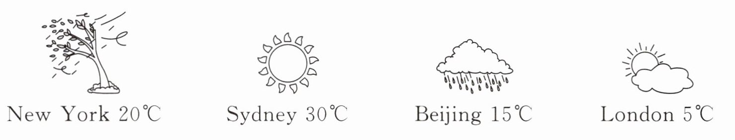 New York 20℃ Sydney 30℃ Beijing 15℃ London 5℃