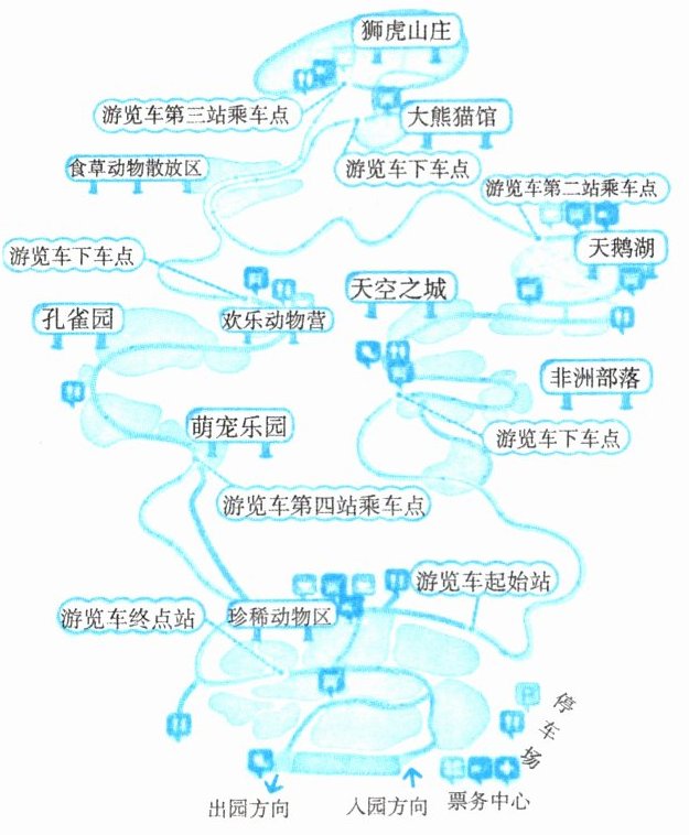 Yunnan Safari Park(云南野生动物园) is the largest zoo in Yunnan Province.There are many kinds of wild animals in it, such as peacocks(孔雀), giraffes, pandas and so on.The picture on the right is the map of Yunnan Safari Park.