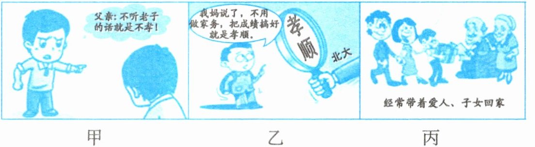 甲图中的父亲说:“不听老子的话就是不孝!”乙图中的孩子说:“我妈说了,不用做家务,把成绩搞好就是孝顺。”