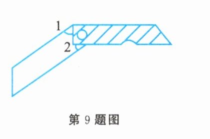 9. 如图所示是我们生活中经常接触的小刀,小刀刀柄外形是一个直角梯形,刀片上、下是平行的,转动刀片时会形成∠1,∠2,则∠1+∠2=
