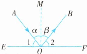 任务1:光在反射时,光束的路径可用如图所示来表示,AO 叫作入射光线,OB 叫作反射光线,从入射点 O 引出的一条垂直于镜面的射线叫作法线。AO 与 OM 的夹角α叫作入射角,OB 与 OM 的夹角β叫作反射角。根据科学实验或量一量或通过查阅资料,可得反射角β与入射角α的数量关系是
