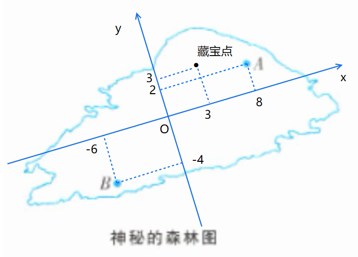 一个寻宝者,从散传的资料中看到,在一个神秘的森林里有一个隐秘的地洞,里面藏着许多珍宝,资料中对藏宝地点的描述是这样的:这个神秘的森林里有两块天然巨石,神秘的森林的图上分别用点A,B表示;在一个平面直角坐标系中,这两点的坐标是A(8,2),B(-6,-4),藏宝地点的坐标是(3,3)。