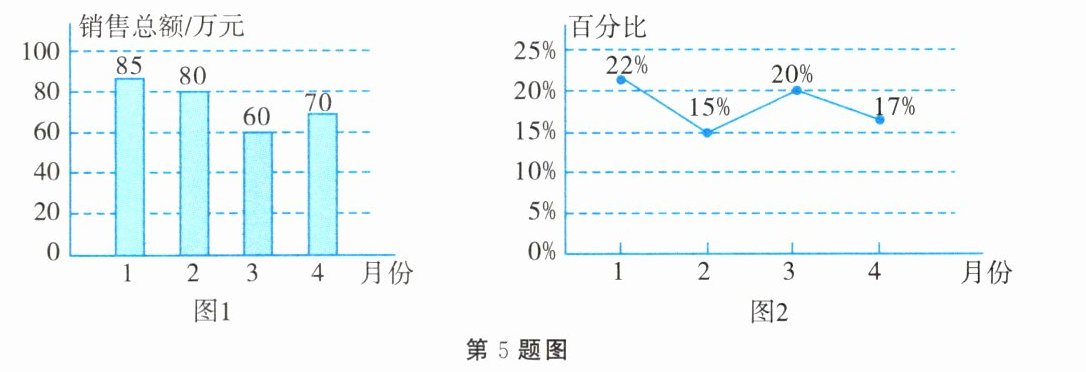 5.某电商网站今年1-4月份电脑的各月销售总额如图1所示,其中“A型”电脑的销售额占当月电脑销售总额的百分比如图2所示.以下四个结论中正确的是(