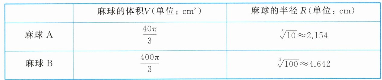 5. 麻球是昆明早点中的新秀,外形圆润。小兰一家买了3个麻球,麻球的主体结构是球体,根据球体体积公式$V=\dfrac{4\pi R^{3}}{3}$(R为球体半径),计算得到下表数据: