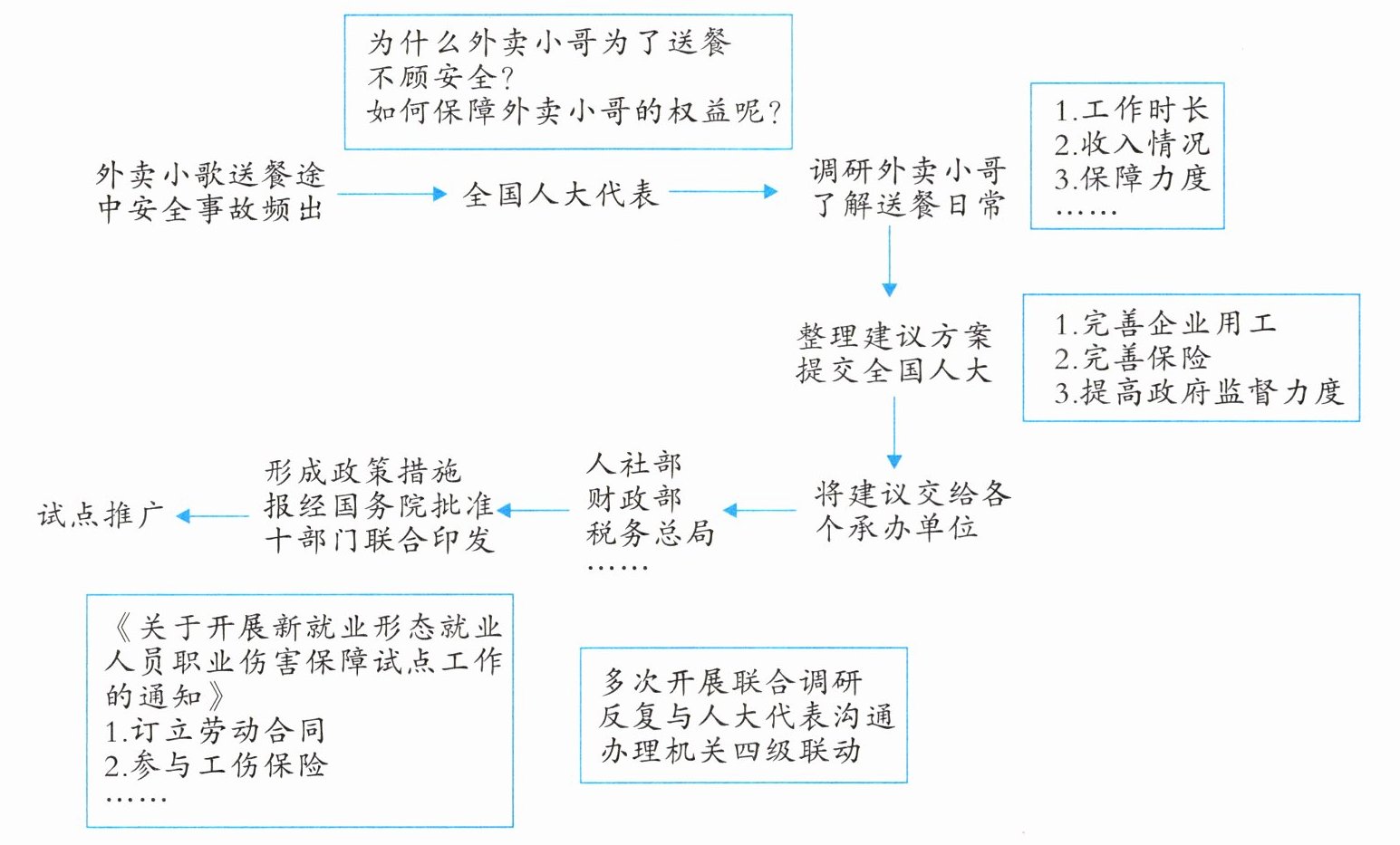 示例:全国人大代表关注到外卖小哥送餐安全事故频发等问题后,通过调研了解情况并整理建议方案提交全国人大。之后各承办单位(如人社部、财政部等十部门)多次开展联合调研,反复沟通,形成政策措施并试点推广,保障了外卖小哥的权益,这体现了人大代表为人民发声,国家机关积极作为,推动解决民生问题。