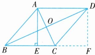 13. 如图所示,在菱形 ABCD 中,对角线 AC,BD 交于点 O,过点 A 作 BC 的垂线,垂足为点 E,延长 BC 到点 F,使$CF = BE$,连接 DF.