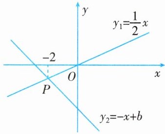 6. 如图所示,已知正比例函数$y_{1}=\frac {1}{2}x$与一次函数$y_{2}=-x+b$的图象交于点P,点P的横坐标为-2,则由图可知方程组$\left\{\begin{array}{l} \frac {1}{2}x-y=0,\\ x+y=b\end{array}\right. $的解为
