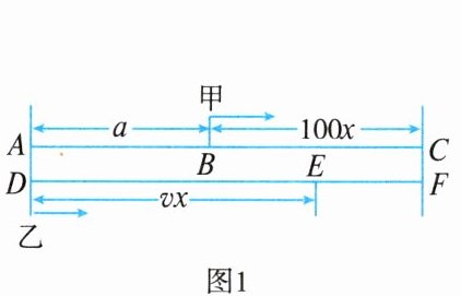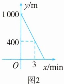 5. 如图 1 所示,甲、乙两人沿江边休闲道同向而行,甲步行的速度为 $ 100 $ m/min,乙骑公共自行车的速度为 $ v $ m/min,起初甲在乙前 $ a $ m 处,两人同时出发,当乙追上甲时,两人停止前行. 设 $ x $ min 后甲、乙两人相距 $ y $ m,$ y $ 与 $ x $ 的函数关系如图 2 所示. 则以下结论: ①图 1 中 $ a $ 表示 $ 1000 $;②图 1 中 $ EF $ 表示 $ 1000 - 200x $;③乙的速度为 $ 200 $ m/min; ④若两人在相距 $ a $ m 处同时相向而行,$ \frac{10}{3} $ min 后相遇. 其中正确的有 (