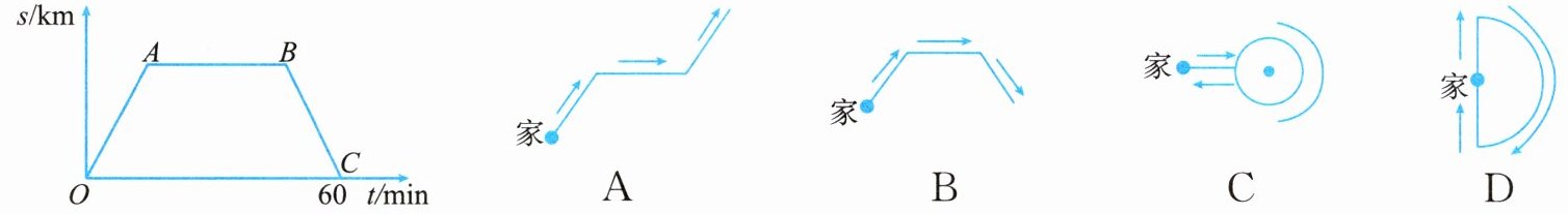 4. 星期六早晨,蕊蕊妈妈从家里出发去公园锻炼,她连续、匀速走了 $ 60 $ min 后回家,如图所示的折线段 $ OA - AB - BC $ 是她出发后所在位置离家的距离 $ s(km) $ 与行走时间 $ t(min) $ 之间的函数关系. 下列图形中可以大致描述蕊蕊妈妈行走的路线是 (