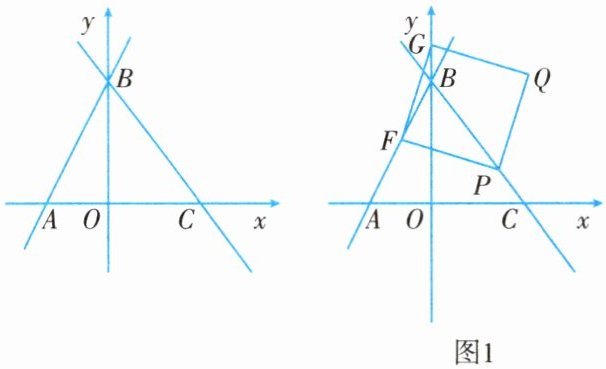 (2)如图 1 所示,设点 $ F $ 为线段 $ AB $ 的中点,点 $ G $ 为 $ y $ 轴上一动点,连接 $ FG $,以 $ FG $ 为边向 $ FG $ 右侧作正方形 $ FGQP $. 在 $ G $ 点的运动过程中,当顶点 $ Q $ 落在直线 $ BC $ 上时,求点 $ G $ 的坐标.