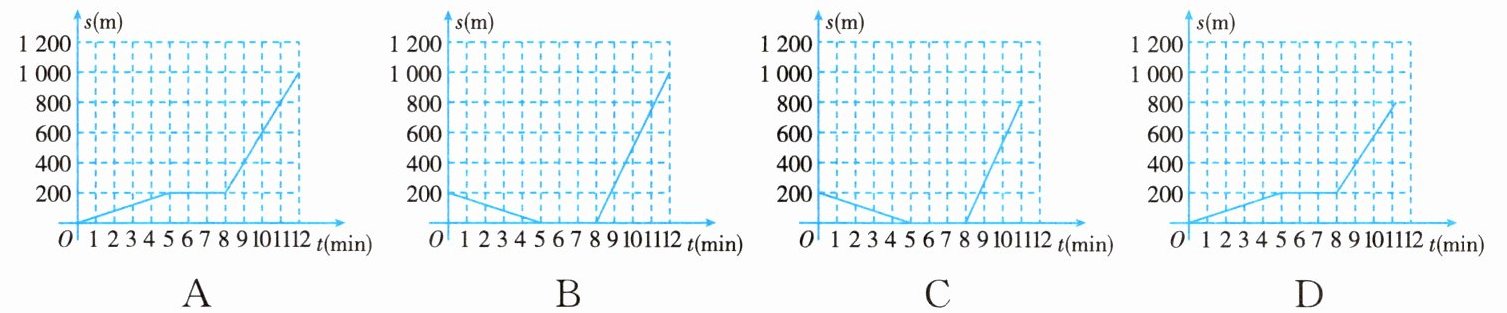 6. 王老师家、超市、公园自西向东依次在同一直线上,家到超市的距离、到公园的距离分别为 200 米、1000 米,她从家出发匀速步行 5 分钟到达超市,停留 3 分钟后骑共享单车,以 250 米/分匀速行驶到公园,设王老师离超市的距离为 s(单位:m),所用时间为 t(单位:min),则下列表示 s 和 t 之间的函数关系的图象中,正确的是(