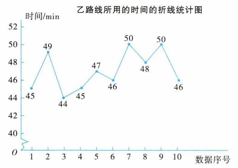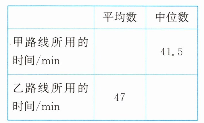 甲路线平均所用的时间少. 理由如下:由题意, 得甲路线所用的时间的平均数为 45,∵ 45<47,∴甲路线平均所用的时间少