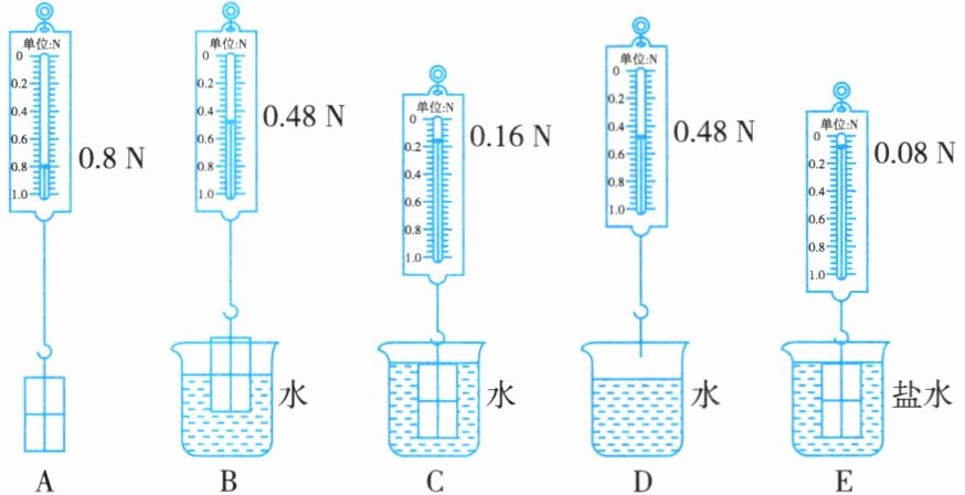 小组为验证上述猜想,用弹簧测力计、4个相同的小长方体磁力块、2个分别盛有水和盐水的烧杯等,按下图步骤进行实验: