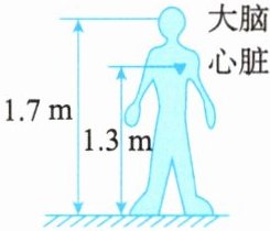 8. 如图所示,某同学身高为1.7m,其心脏位置距离地面为1.3m,当心脏收缩,将血液压送到大脑时,心脏对血液产生的压强至少为