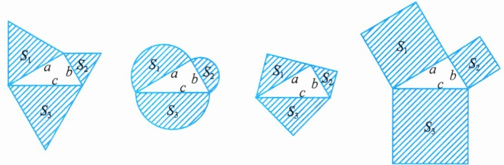 5. 如图所示,以直角三角形的三边$a$,$b$,$c$为边,向外作等边三角形、半圆、等腰直角三角形和正方形,上述四种情况的面积关系满足$S_{1}+S_{2}=S_{3}$的图形有(