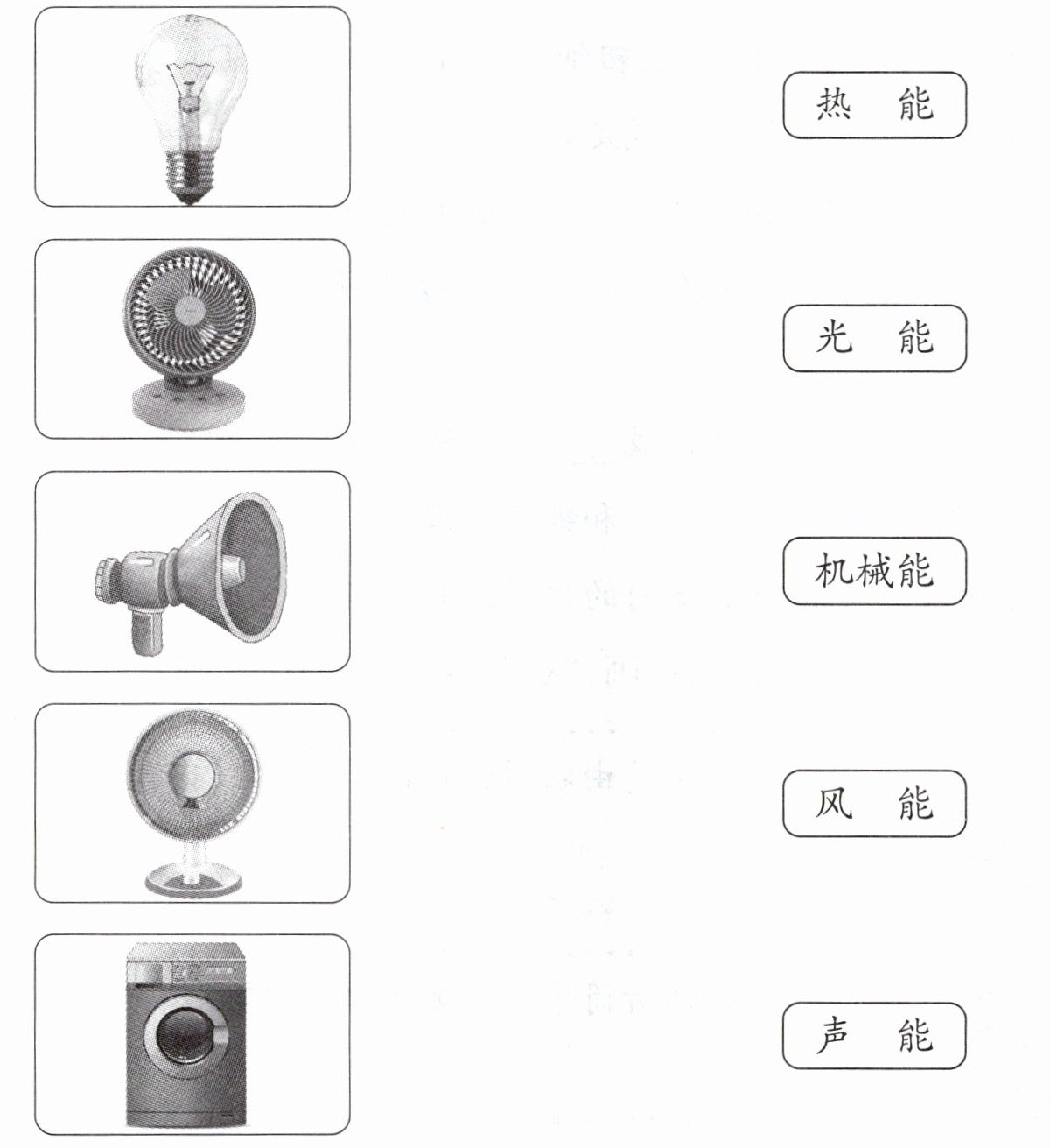 灯泡——光能、热能;电暖器——热能;扩音器——声能;电风扇——风能、机械能;洗衣机——机械能 。