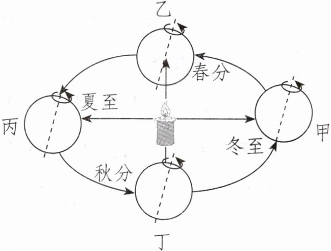 1. 小明用简易地球仪、蜡烛搭建一个模型来探究地球的公转。他选择了甲、乙、丙、丁四个位置来观察地球仪运动时产生的现象。右图是小明的地球公转模型设计图。
