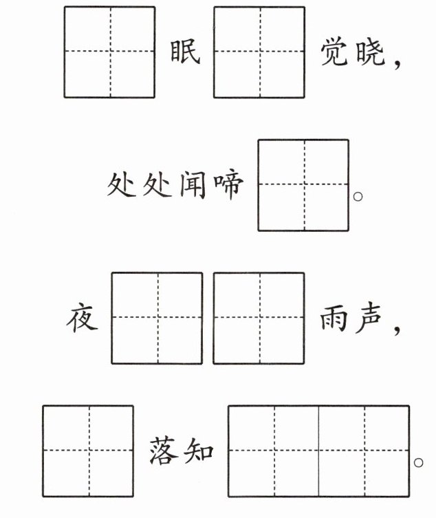 五、华华的书被弄脏了,《春晓》这首诗有的地方看不清字,请你根据所学内容帮她补充完整,并完成练习。