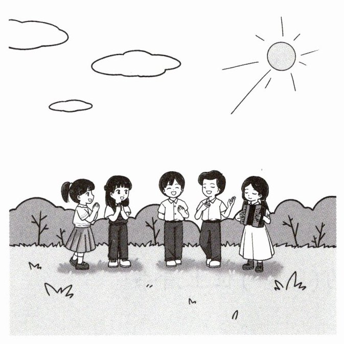 在一片绿油油的草地上,同学们欢快地唱着歌。蓝天上飘着几朵白云,阳光洒在草地上,洒在同学们身上。同学们的笑声随着歌声传得很远很远。