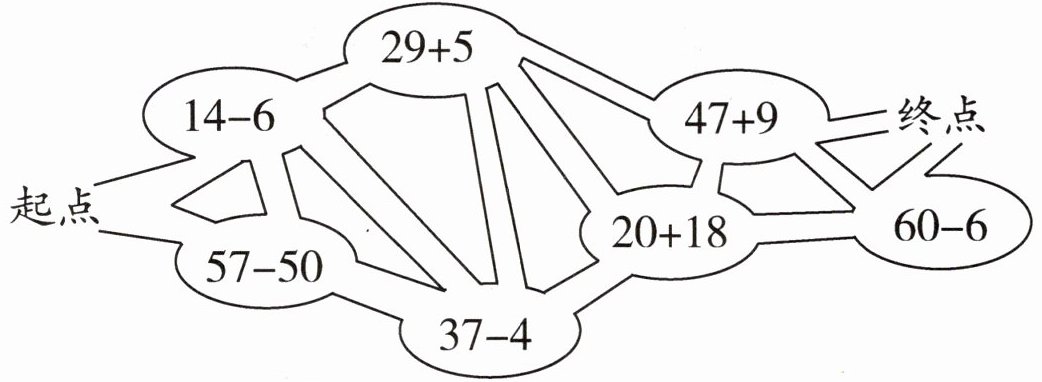 起点→57 - 50→14 - 6→37 - 4→29 + 5→20 + 18→60 - 6→47 + 9→终点