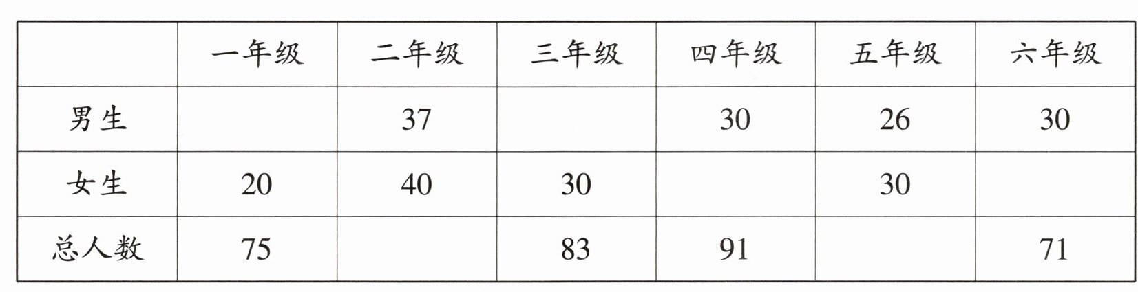 1. 下表是某小学各年级跳绳比赛的人数统计,请你帮忙填完整。