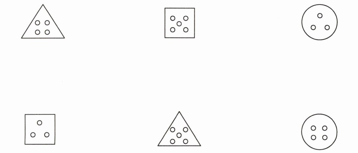 【解析】:观察图形,将外形相同的扣子用线连接起来,即三角形与三角形相连,正方形与正方形相连,圆形与圆形相连。