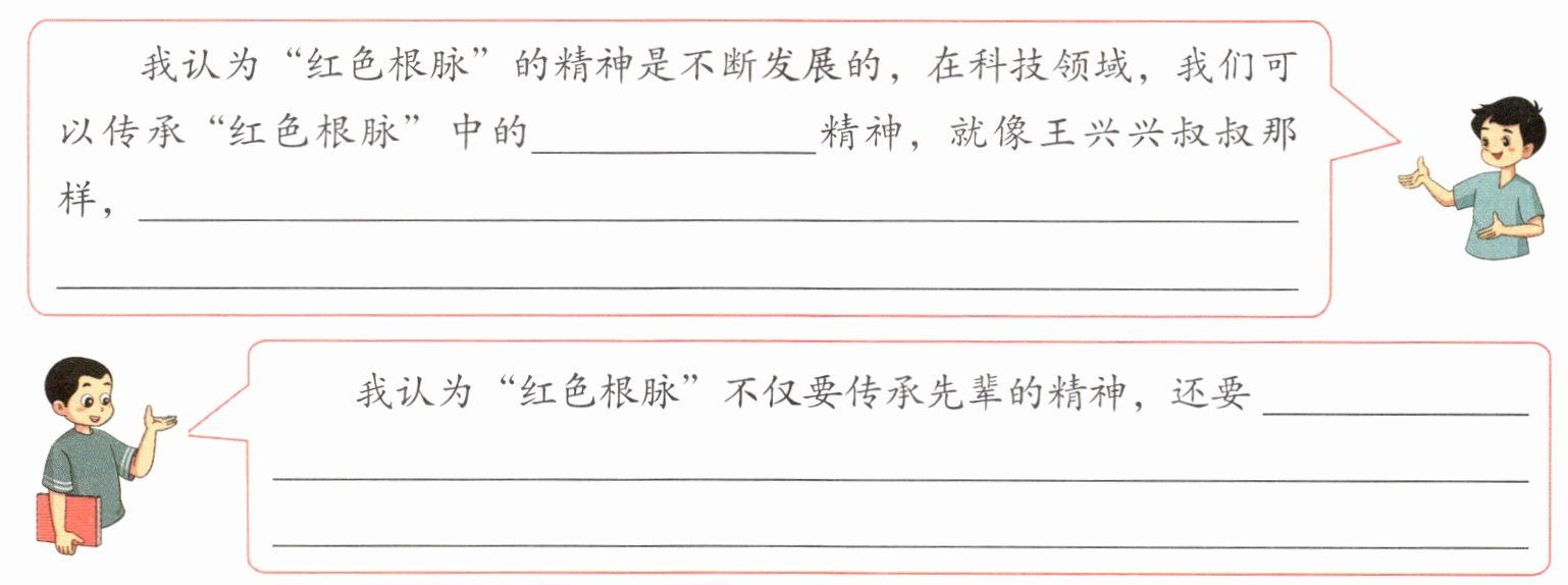 示例:"红色根脉"蕴含首创、奋斗、奉献等精神。赓续精神需像王兴兴般发扬首创精神,独立研发核心技术;像红军长征般百折不挠,学习中遇困难不退缩,坚定信念实现梦想。