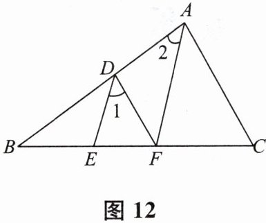14. 如图 12,已知 DE 平分$∠BDF$,AF 平分$∠BAC$,且$∠1=∠2$,试判断 AC 与 DF 的位置关系,并说明理由.