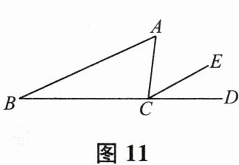 13. 如图 11,已知 D 是 BC 延长线上一点,$CE// AB$.若$∠A=63^{\circ },∠ACD=87^{\circ }$,则$∠B$的度数为