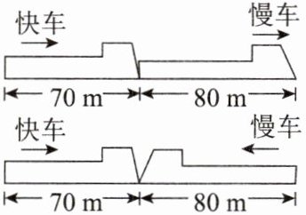 9. 如图所示,一列快车长 70 m,一列慢车长 80 m. 若两车同向而行,则快车从追上慢车车尾到完全超过慢车所用的时间为 20 s;若两车相向而行,则两车从相遇到完全离开所用的时间为 4 s. 求两车的速度.