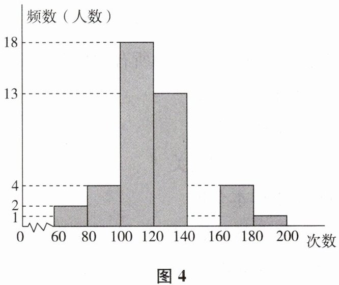 9. 某中学积极开展跳绳锻炼,一次锻炼后,体育委员统计了全班同学单位时间的跳绳次数,制成的频数分布表和频数分布直方图(图4)如下: