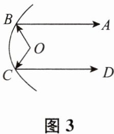4. 图 3 所示的是一汽车探照灯纵剖面的示意图,从位于点 O 的灯泡发出的两束光线 OB,OC 经过灯碗反射后平行射出,如果$∠ABO=α,∠DCO=β$,那么$∠BOC$的度数是 (