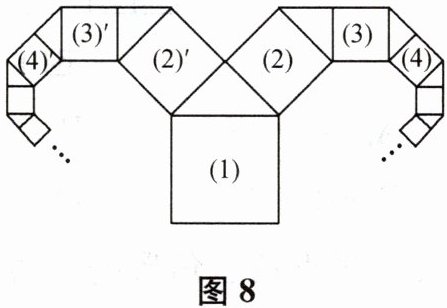14. 如图 8 是一种“牛头形”图案,其作法是从正方形(1)开始,以它的一边为斜边,向外作等腰直角三角形,再以其直角边为边,向外作正方形(2)和(2)'. 依次类推,若正方形(1)的边长为 64 cm,试推测正方形(7)的边长.