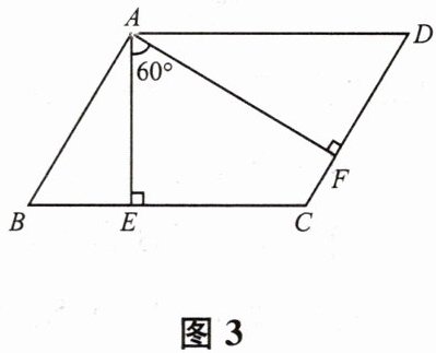 9. 如图3,在$□ ABCD$中,已知$AE\perp BC于点E$,$AF\perp CD于点F$.若$\angle EAF= 60^{\circ}$,$BE= 2 cm$,$FD= 3 cm$,求$AB$,$BC的长和□ ABCD$的面积.