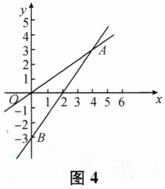11. 已知正比例函数与一次函数的图象如图 4 所示,它们的交点坐标为 $ A(4,3) $, $ B(0,-3) $ 为一次函数的图象与 $ y $ 轴的交点.
