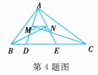 4. 如图,$\triangle ABC$的周长为$19$,点$D$,$E$在边$BC$上,$∠ABC$的平分线垂直于$AE$,垂足为点$N$,$∠ACB$的平分线垂直于$AD$,垂足为点$M$,若$BC=7$,则$MN$的长度为 (