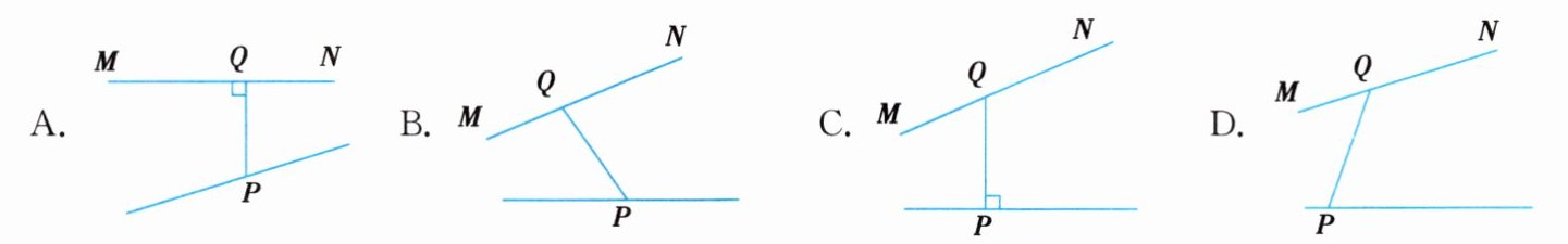 4. 下列图形中,线段$PQ$的长为点$P$到直线$MN$的距离的是 (