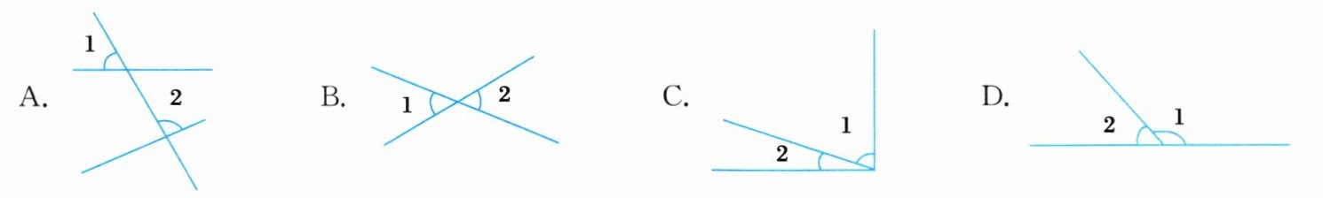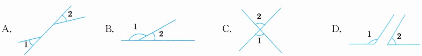 1. 下列各图中,$\angle 1$与$\angle 2$互为邻补角的是 (