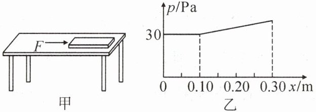 6. 如图甲所示,一块质量分布均匀的长方形木板平放在水平桌面上,对长木板施加一个水平向右的力F,使木板沿着与桌子边缘平行的方向缓慢向右做直线运动,直到木板的$\frac {1}{4}$长度伸出桌面时停止运动,此过程中木板对桌面的压强p与木板被推动的距离x的关系图像如图乙所示.已知木板宽为0.25m,下列判断正确的是 (